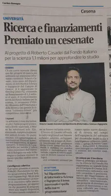 - Il Resto del Carlino - Cesena (21/01/2026): Informatica e innovazione. Fondi per 1,1 milioni di euro - Finanziato dal Fondo Italiano per la Scienza un progetto di ricerca messo a punto da Roberto Casadei: “Selezioneremo diversi ricercatori”.